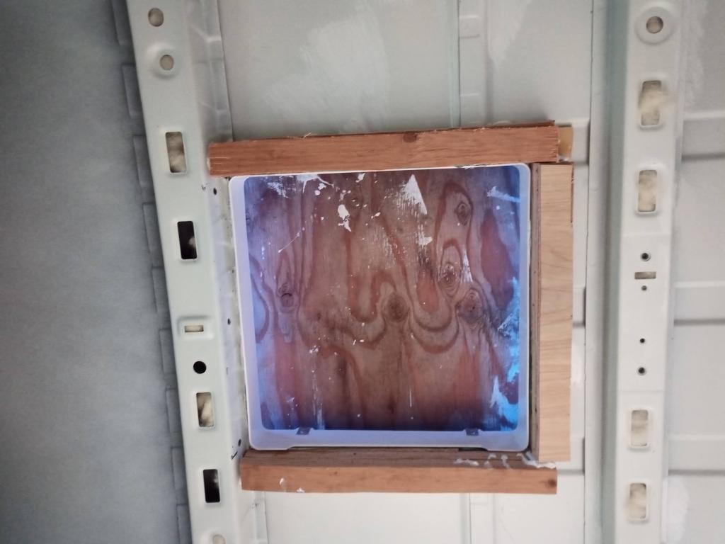 While Matt worked on cutting the roof, I made a frame for the three sides of the fan that would not be adjacent to a rib. After a quick check to make sure everything fit properly, we were ready to secure it all in place. Because we’re working on a van and seemingly nothing is square or even, we ended up with a few more shims than anticipated. This wasn’t a huge deal, but it did slow things down a little and we were already on a time crunch to get this to a good stopping point before an incoming storm arrived.