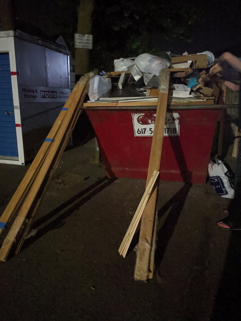 One night in late May, while we were still very much undecided on what our next step would be, Matt returned to the apartment after taking out the trash with more excitement on his face than I would ever expect from someone doing such a chore. He told me there was wood in the dumpster, a lot of it, and that it appeared to be in decent condition. I followed him outside to take a look.