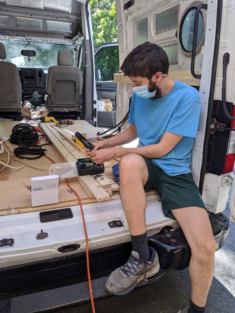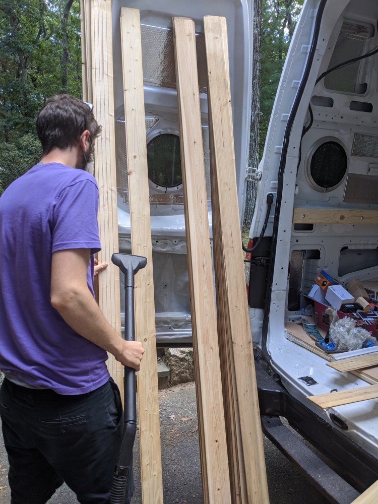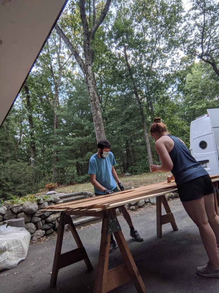 As you might have guessed from the title of this post, we’ve been working on the van ceiling using materials that were quite literally another man’s trash. More specifically, our landlord’s trash. We pulled this wood out of a dumpster before we had even committed to a van build. When our NOBO thru hike was called off we spent several weeks weighing other options: a possible SOBO hike, build out a van, buy a house. Our nights and weekends were occupied with browsing house listings, used van listings, and the latest covid updates and travel restrictions.