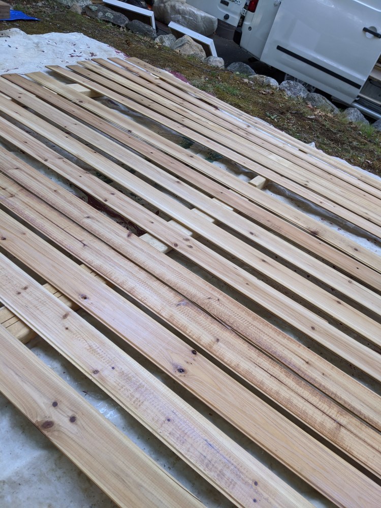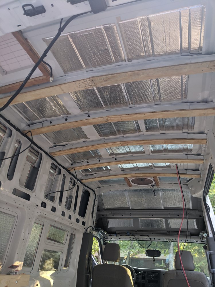 On Sunday morning we brought the wood to Matt’s parents’ house, where we could spread it out and see more clearly how much of it is usable. We gave it all another cleaning as it was unloaded, separated it by condition, then got to work finishing up the sound dampening on the van roof and installing the furring strips for the ceiling.