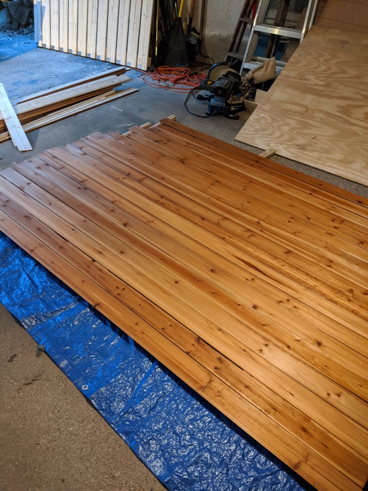 After living with stacks of this in our tiny apartment for the past three and a half months, I’m happy to finally be able to say it was worth it. Fast forward to this past weekend where a little sanding, conditioning, and wood finish later, we have a beautiful, nearly free, cedar ceiling just about ready to install.