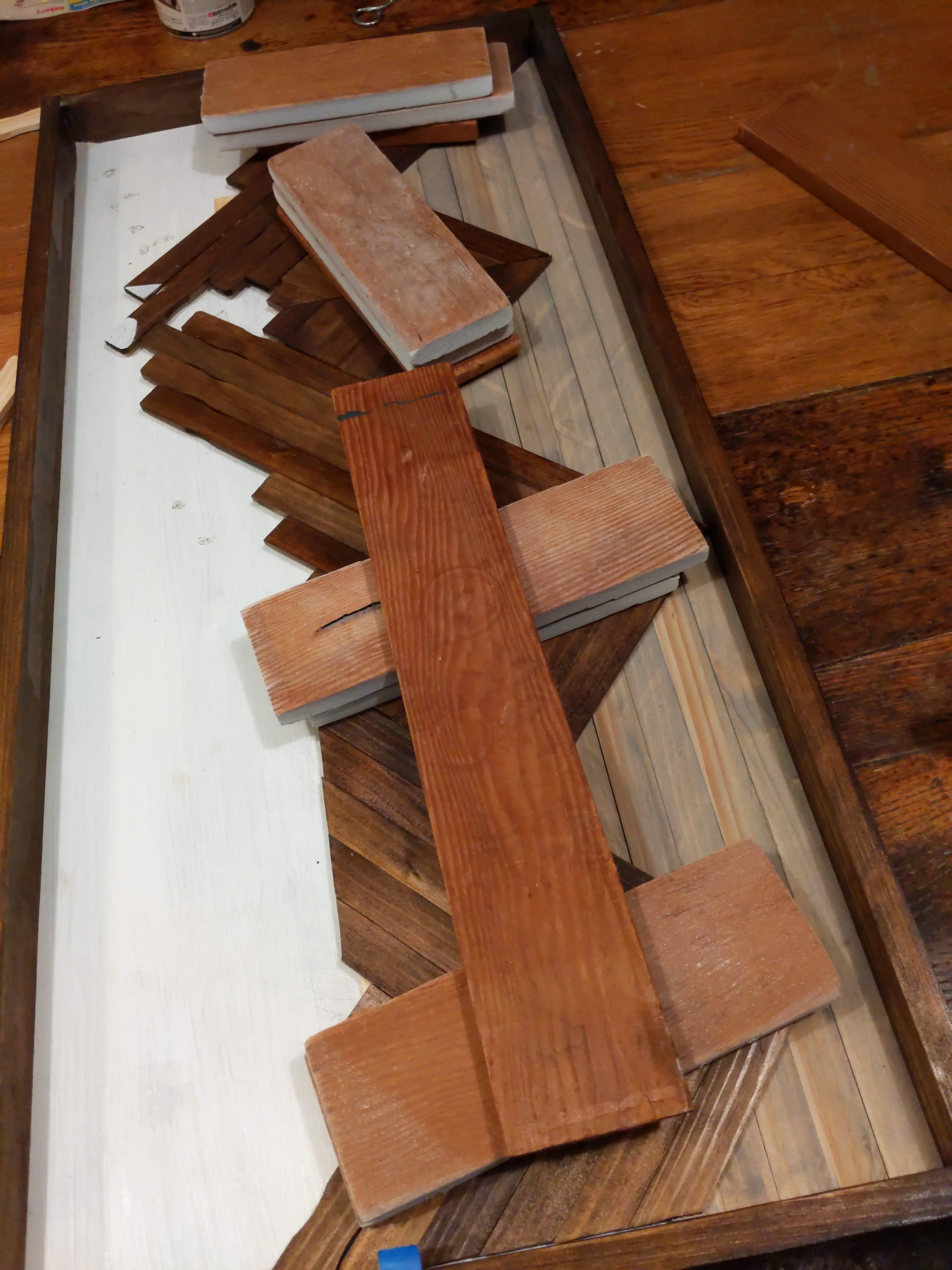 The backsplash was truly a group effort, between my dad’s troubleshooting and taking the time to help me get everything cut, Emma brainstorming a few aspects of it with me, and my mom providing some sanity checks and helping me get it assembled as I ran out of time. There was a slight delay in getting started, because when I tested the stain on the wood I had intended to use it didn’t take very well at all. I ended up picking up some long paint sticks instead, the ones you use for 5-gallon buckets, along with a few strips my dad cut for me when those ran out.