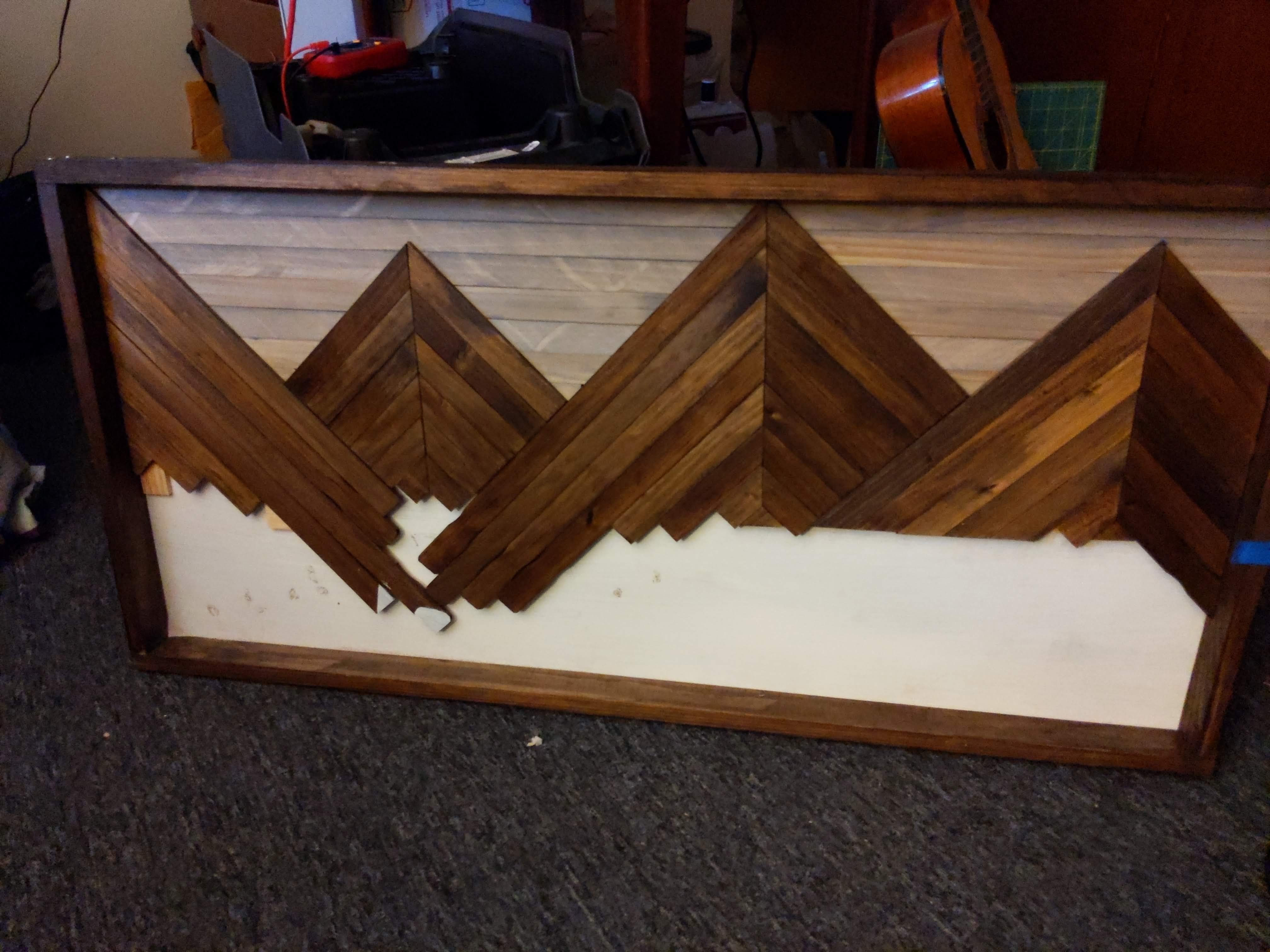 The other thing I want to show you all is the backsplash I made for the van kitchen. I found this idea when I was searching for mountain mural tutorials after seeing one someone had painted in their house. This friend had stuck to muted colors (think misty morning mountains), and my initial thought was that a mural could be a good way to have a little fun with the van interior without overwhelming such a small space. Once we decided to set in the walls a bit wherever we could to maximize usable space though, I had to scratch the mural idea. I decided instead to go with another idea that kept popping up. This one was for a DIY mountain wall hanging made from small strips of wood.