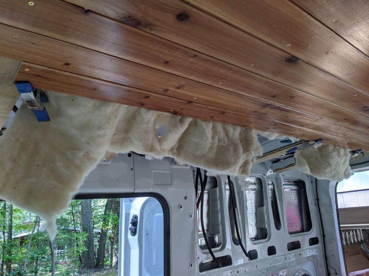 I’m not sure if I’ve mentioned yet that we’re using sheep’s wool insulation. You can’t use adhesive with it, so many people hold it in place with string to prevent it from shifting or falling out of the ceiling and walls. We opted to just work in sections instead, shoving the wool batts between the ceiling and the roof as we went. I’m not sure if we’ll be able to take a similar approach when we get to the walls, but at least for the ceiling this was more efficient.