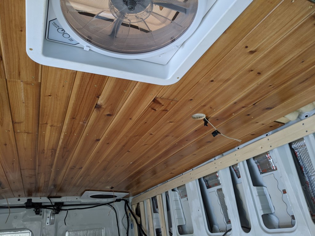 A little side note here, if any of you have looked much online at other people’s campervans, you’ve likely seen how many people use a lot of natural wood in their build. Matt and I both like how that looks, but we’re trying to be mindful of how much weight we’re adding so as not to overload the van by the time we’re done. We’re using thin, lightweight paneling on the walls, and probably would have done something similar on the ceiling had we not pulled the cedar from the dumpster. Given that there won’t be quite as much natural wood in our van as we’d like, getting a little more in as a backsplash was all the more appealing.