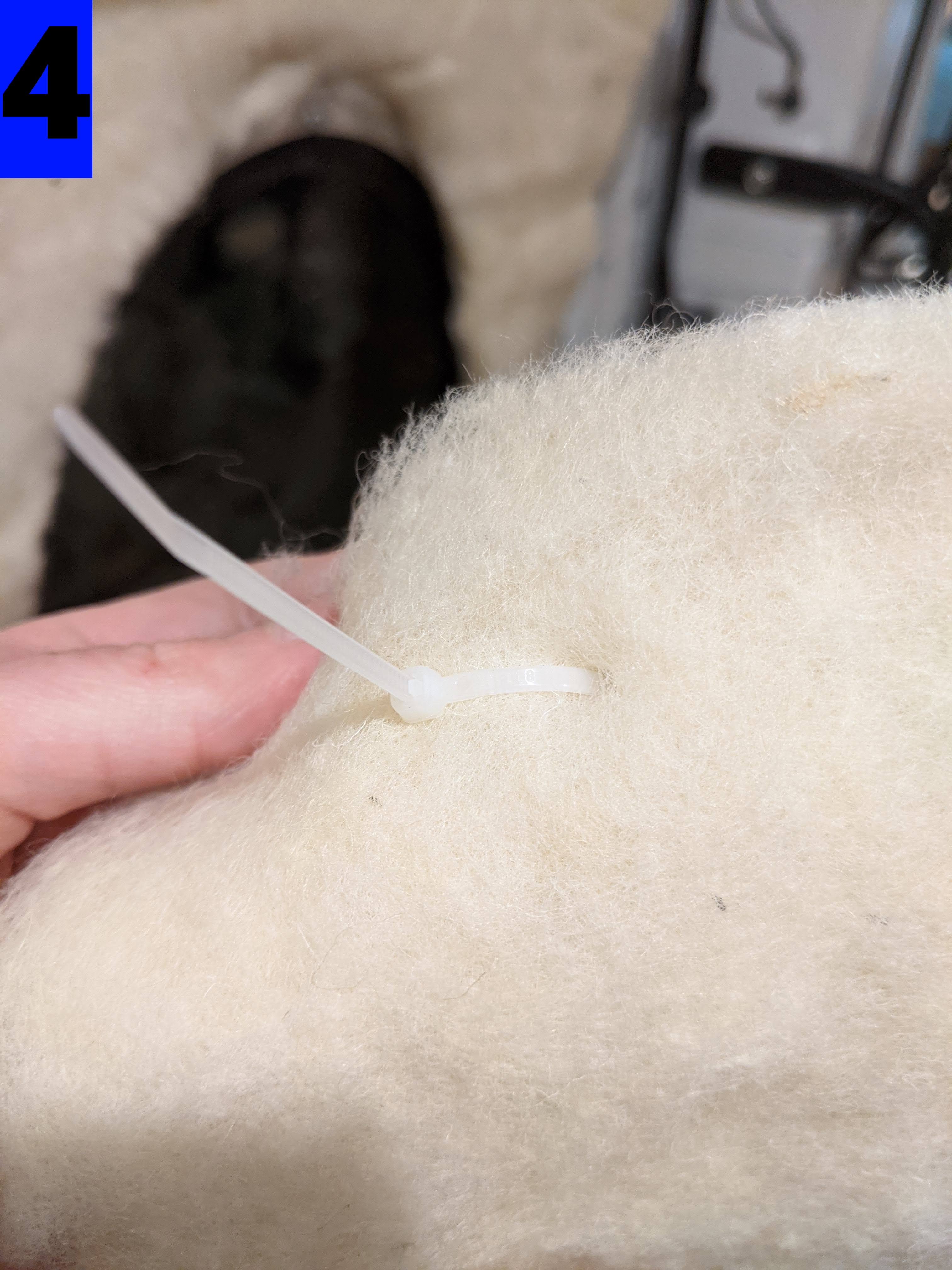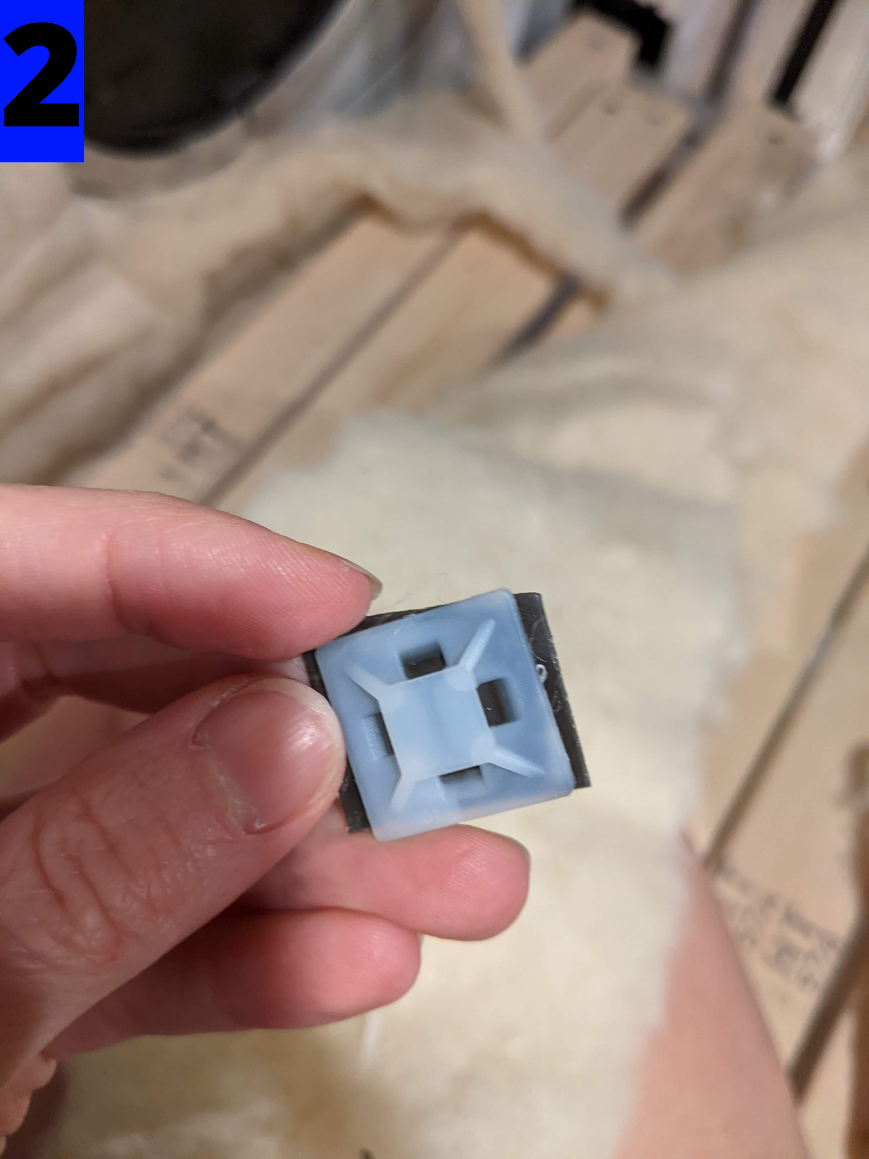 One thing about wool insulation is you can’t use adhesive to install it. The most common solution we’ve seen from other people is to use string to hold the wool in place as they put up the walls and ceiling. Rather than go this route, we thought we’d try using these little zip tie things that Matt had purchased for some other part of this build. We had enough left over and figured we might as well get more use of them. So far, so good!
