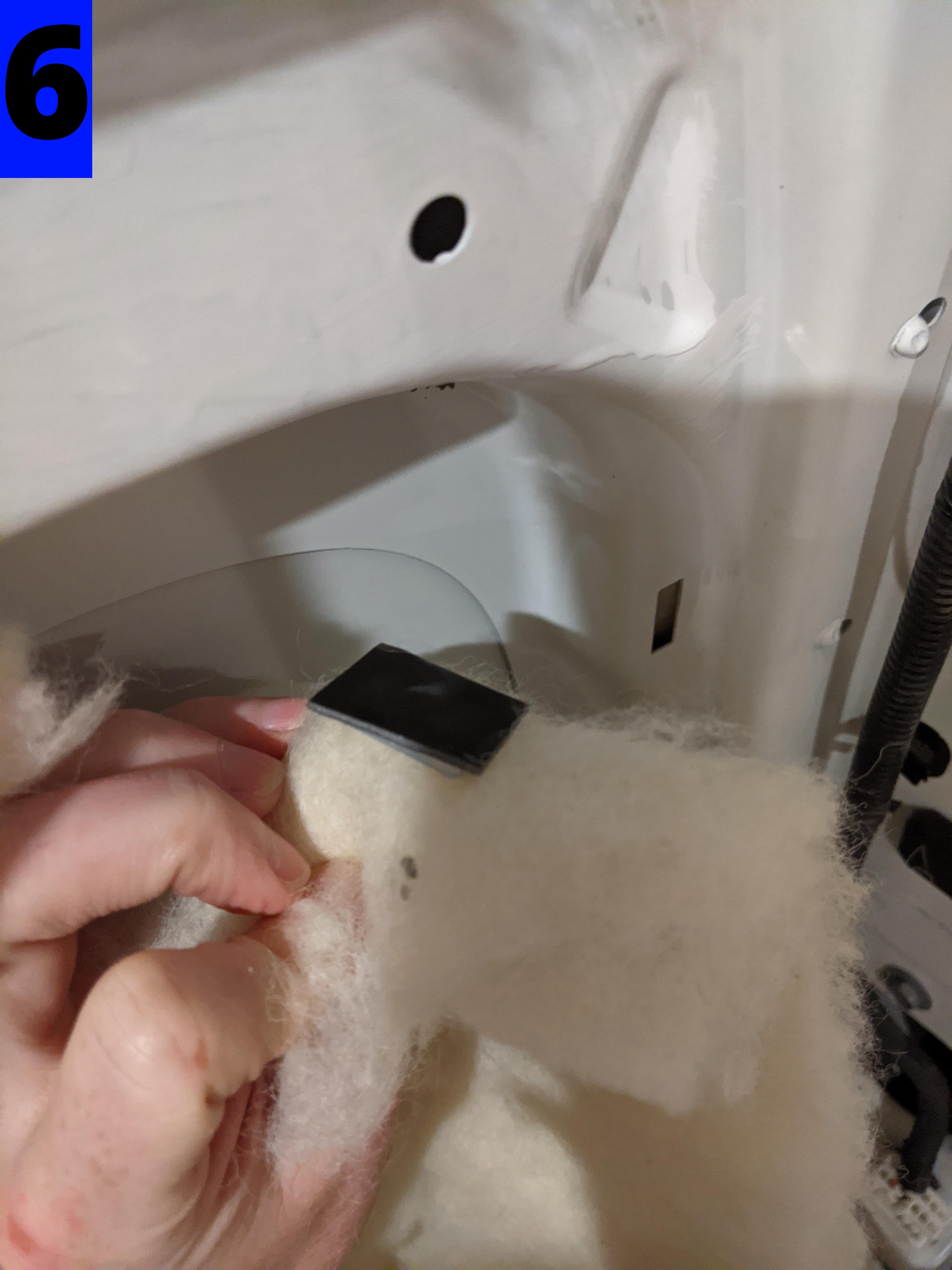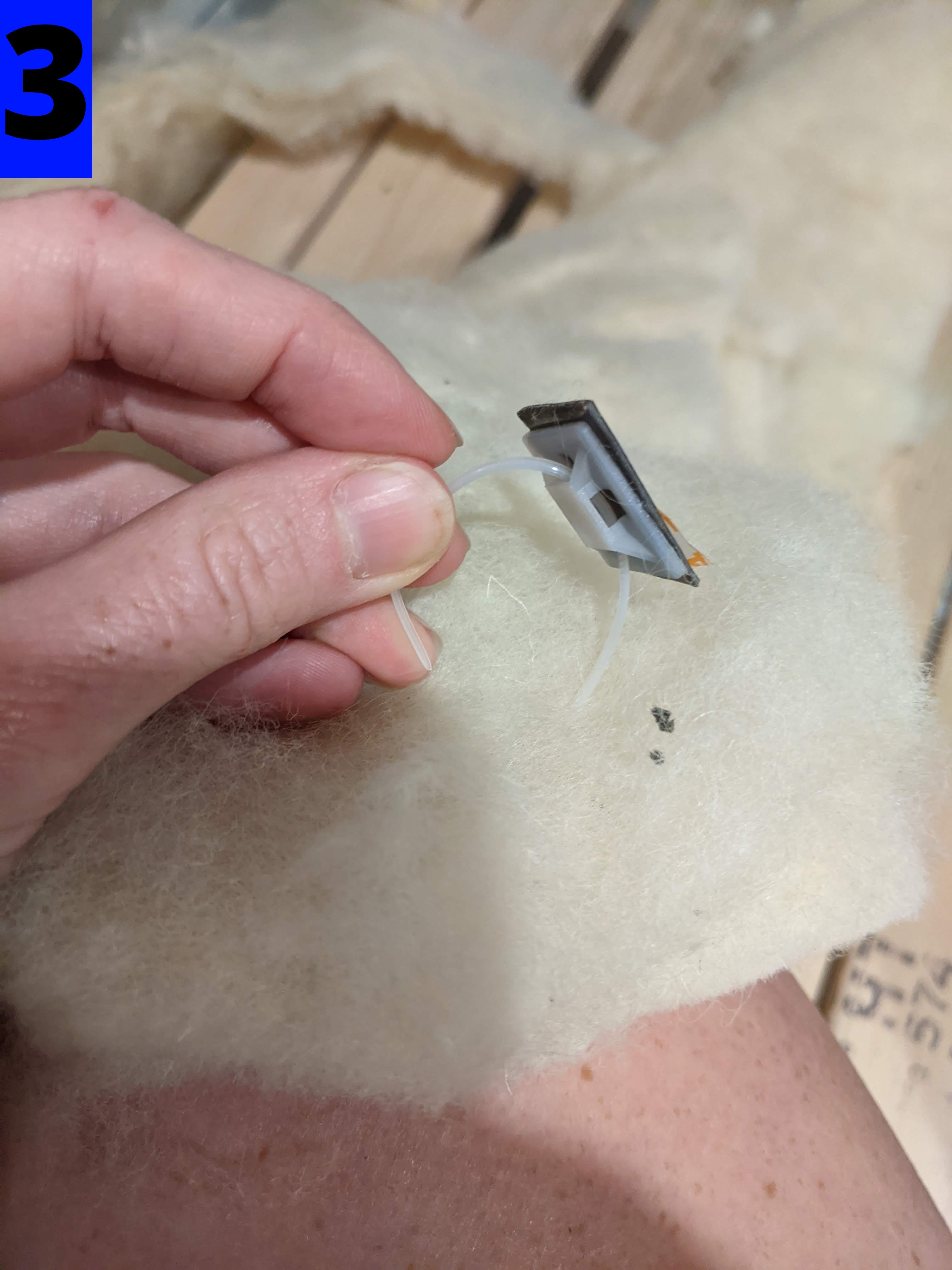 The adhesive on the back of the plastic piece isn’t very strong, so we’ve been scraping that off and replacing it with stronger double-sided tape. We didn’t even bother trying the string method since we already had these, but I don’t think I would do it any other way anyway. A few of these along the top of each batt holds everything in place without compressing the wool nearly as much as I imagine the string would have.