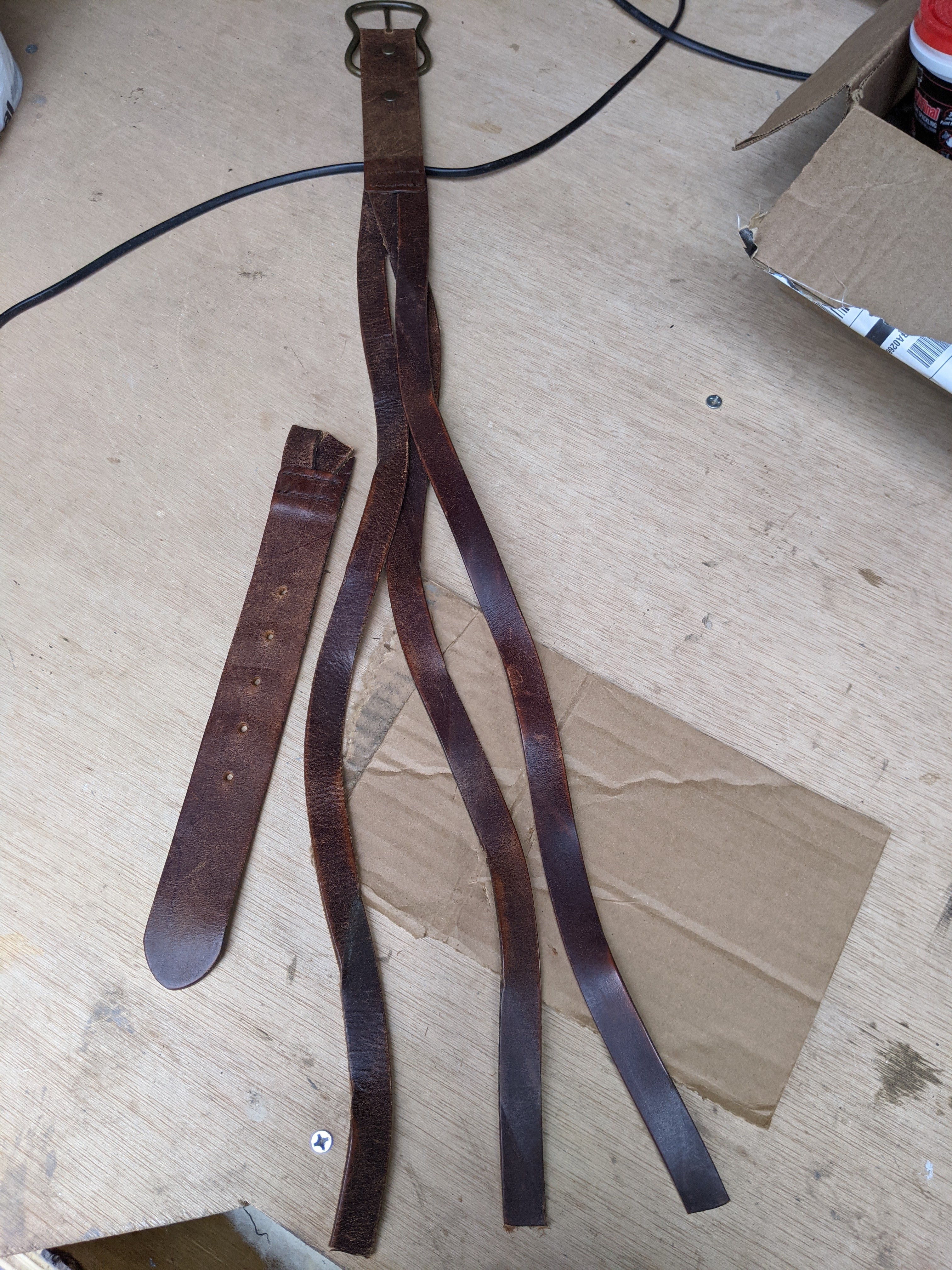 The part I might be the happiest with is the door pulls. I don’t think I’ve showed you any of this yet, but those door pulls I made from a leather belt I picked up from a local thrift store. The belt was so ugly, I probably would have loved it when I was in middle school. It was a wide braid, so I ended up getting three decent length strips of leather out of this one belt. Not bad for $3. I had bought some brass tacks hoping they might work to attach the leather loops, but in the end I decided they’d likely loosen up too much over time so I simply screwed the loops to the door instead