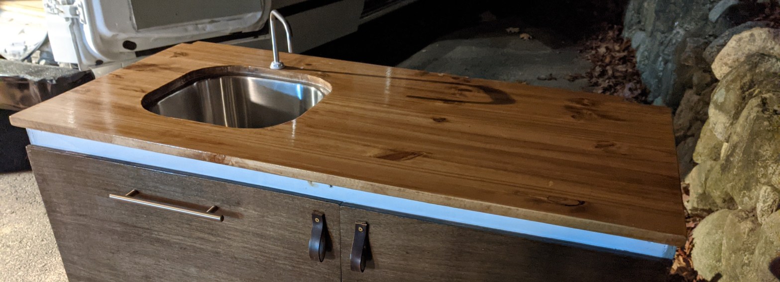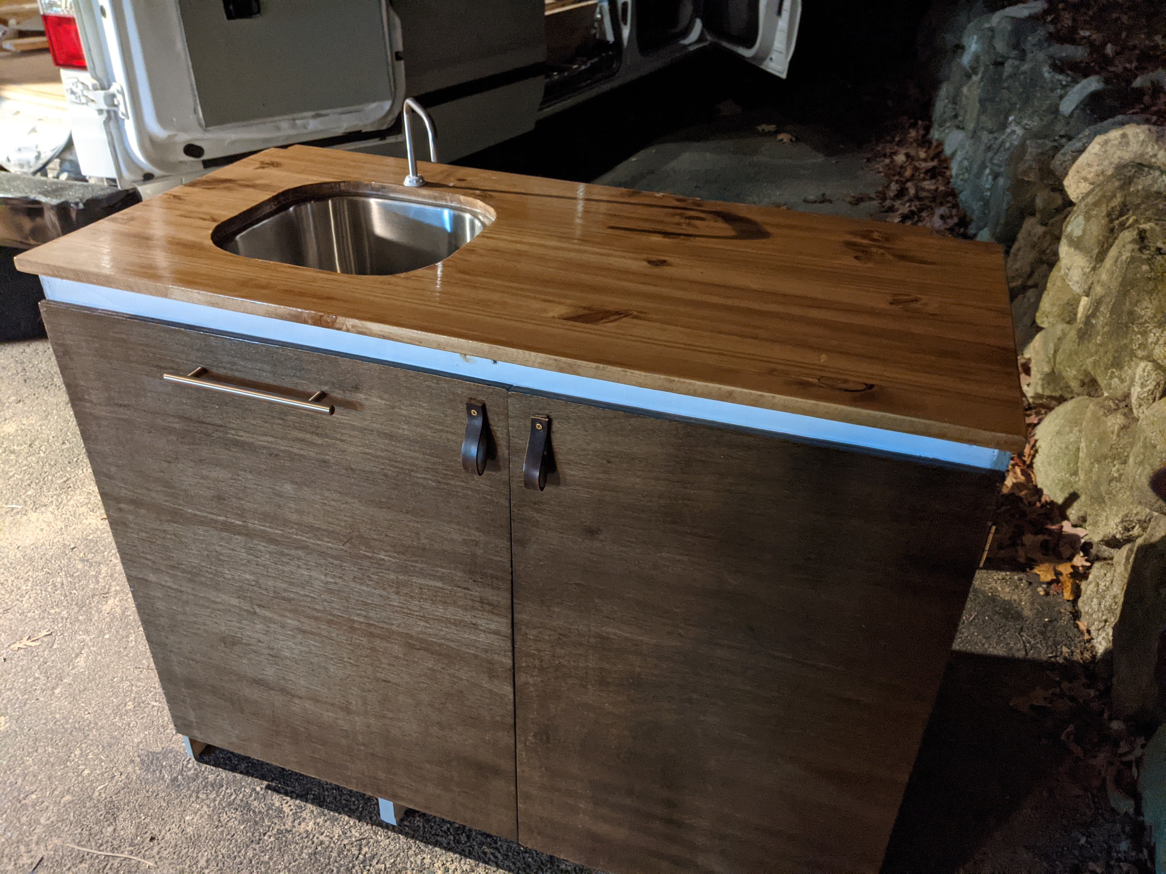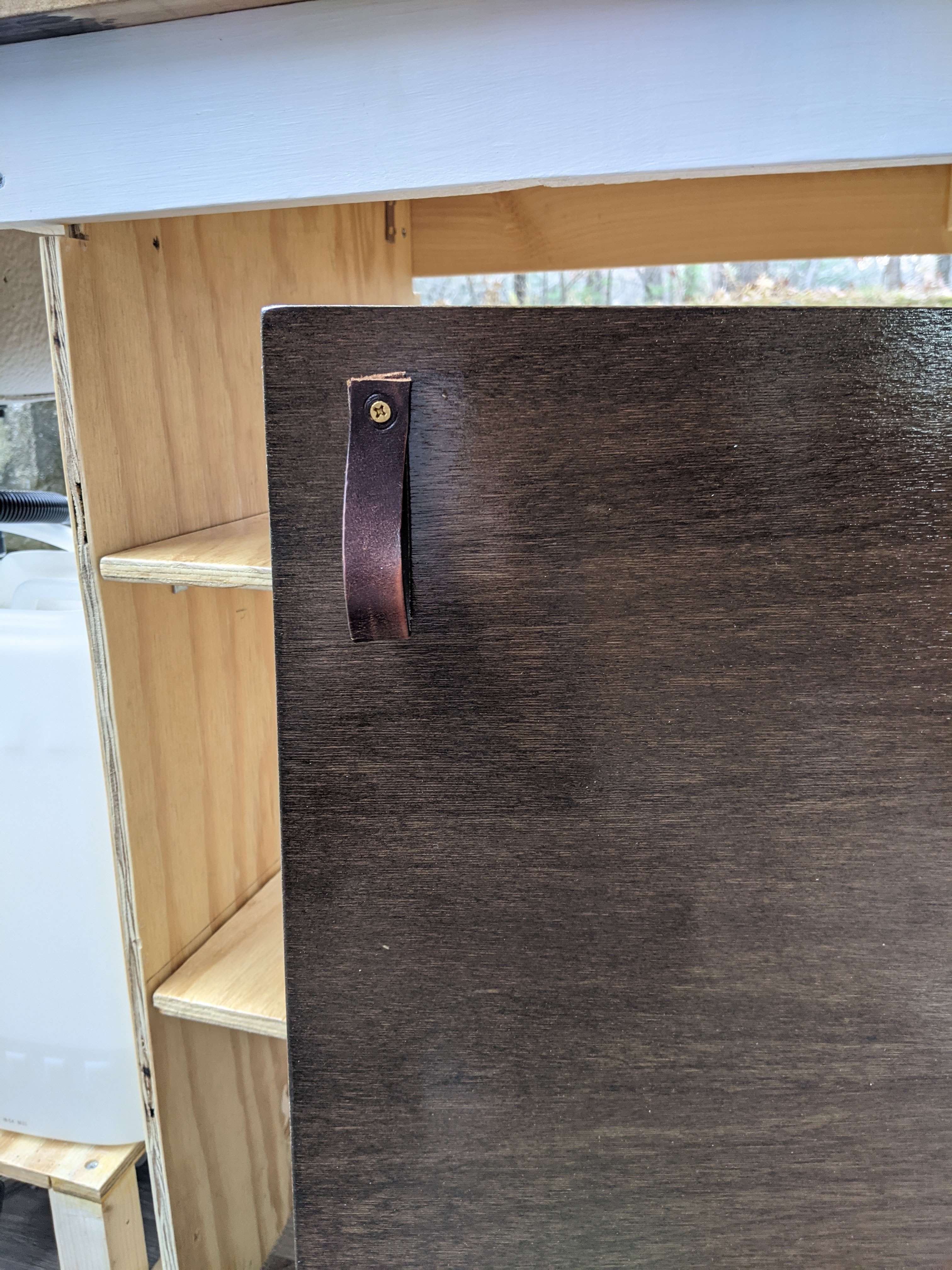 The doors are the same wood and stain as our benches. We really like this color but didn’t want to make the interior too dark, so we used the leftover wall paint on the walls and face of the cabinet. There’s still one section right below the counter where I only got as far as a coat of primer, but we’ve run out of good painting days so that’s just going to have to wait. We should be able to do it once it’s in the van and we can run a heater, but the garage has been too cold lately.