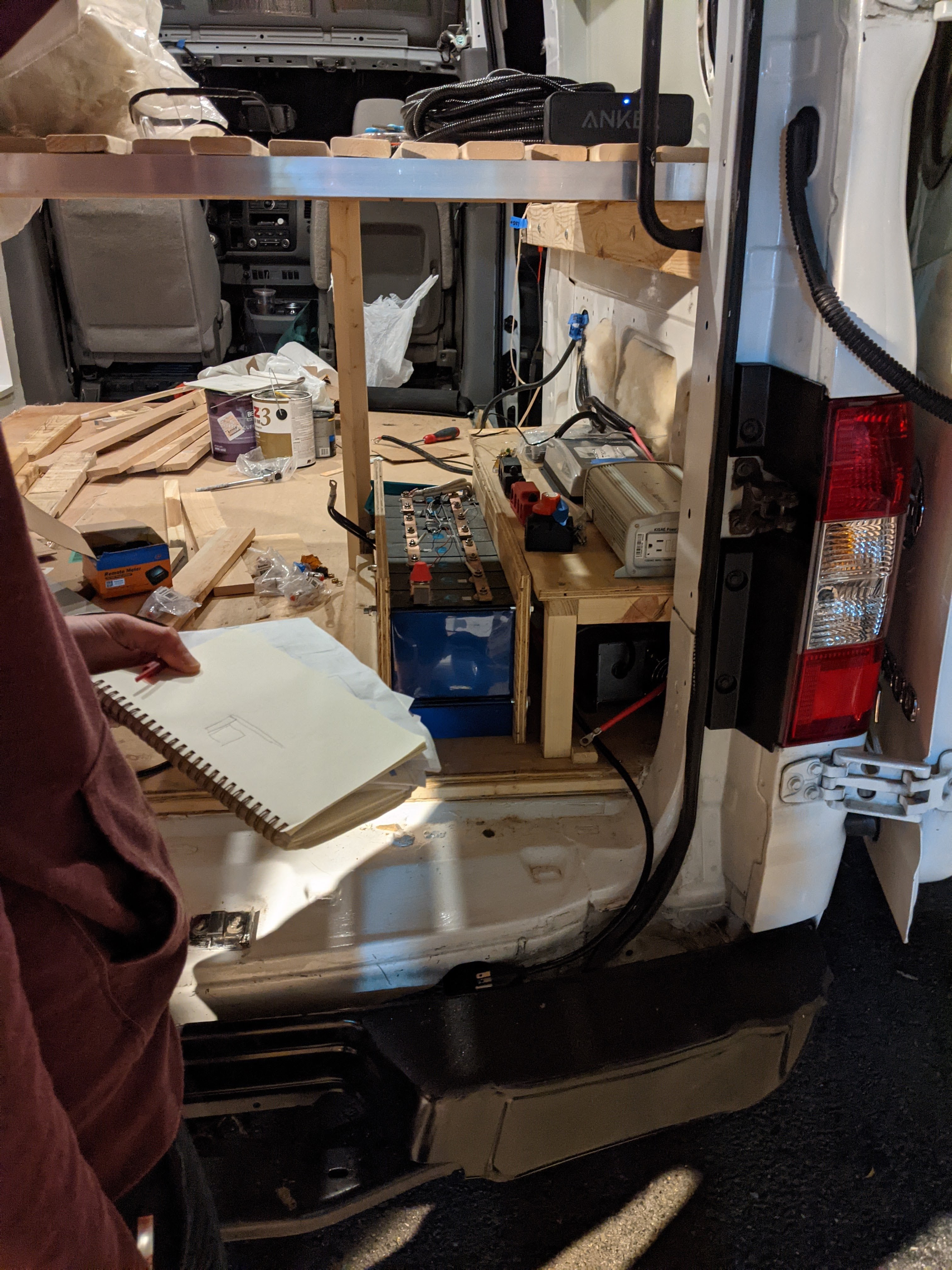 Switching gears completely here, let’s move to the back of the van so I can show you where Matt’s focus has been lately. I’ve shown you various parts of our electric and solar set up in previous posts, well all of that is finally hooked up and we have a working electrical system! This whole system has very much been Matt’s project. He put so much time and thought into all of this, seeing it all come together has been really, really cool.