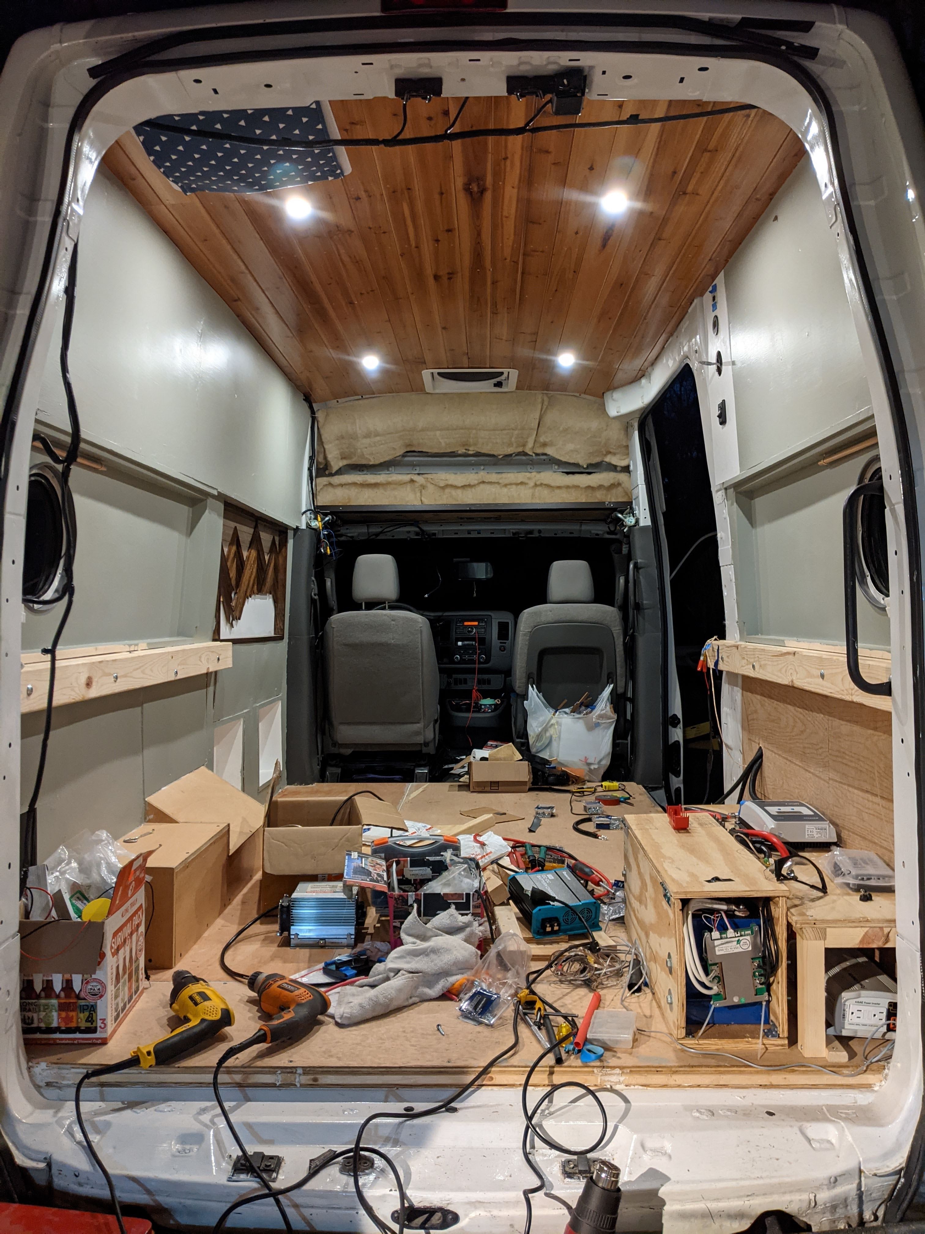 Most of the electrical stuff is under the bed on the passenger side of the van. We initially had it under the bench on that side, but decided instead to leave that space open for things we’ll need more regular access to. There’s a monitor on the wall above that bench, plus we can both monitor the battery management system from our phones, so hopefully there’s no need to go physically messing around with all of it.