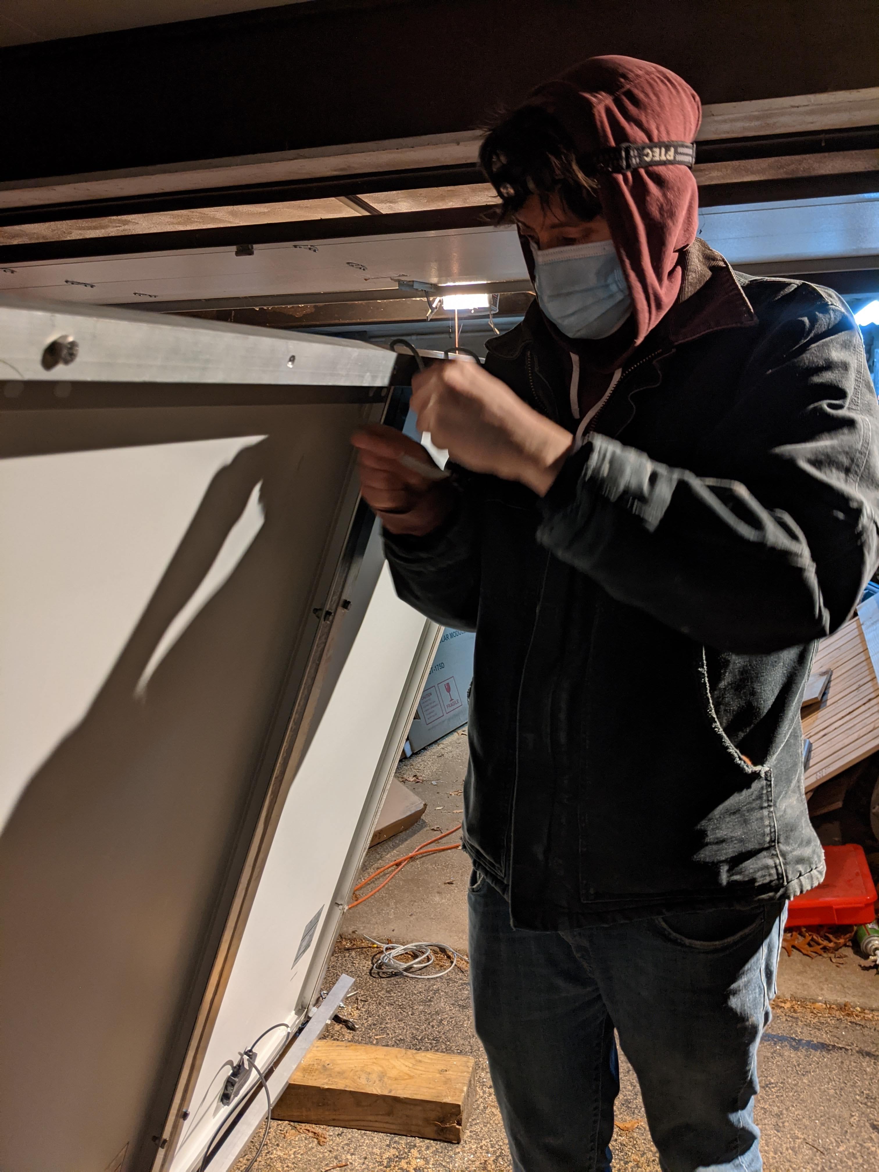 The finishing touch was getting the solar panels mounted on the roof, which turned out to be quite the ordeal. It had been so long since we touched this we forgot the order in which everything had to go together. Only once the rack was mounted and the panels were brought up did we remember the panels had to be mounted to the rack first, and the whole thing brought up together in one piece. Then after that was corrected and the whole thing brought up again, we remembered the bolts to attach the rack to the roof had to be put through the rack before the panels were attached. Yeah, it was a long night.