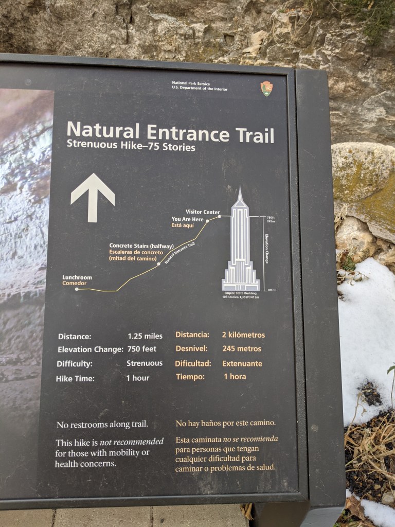The Natural Entrance Trail switchbacks down 75 stories into the cave, winding through various passages and awe-inspiring formations. There are numerous signs along the trail with info on the cave’s formation, history of the exploration of the cave, some of the animals that live there, etc.