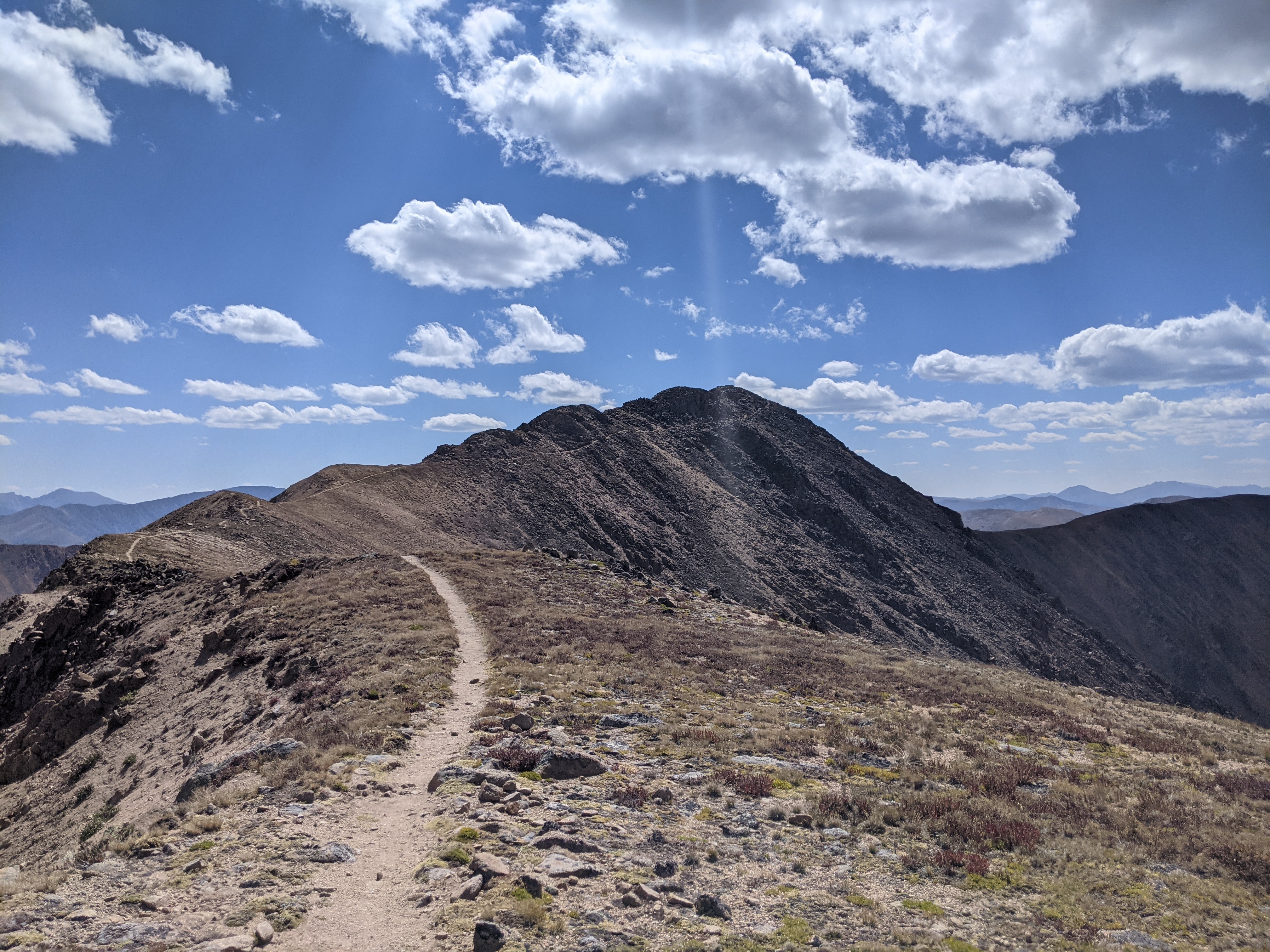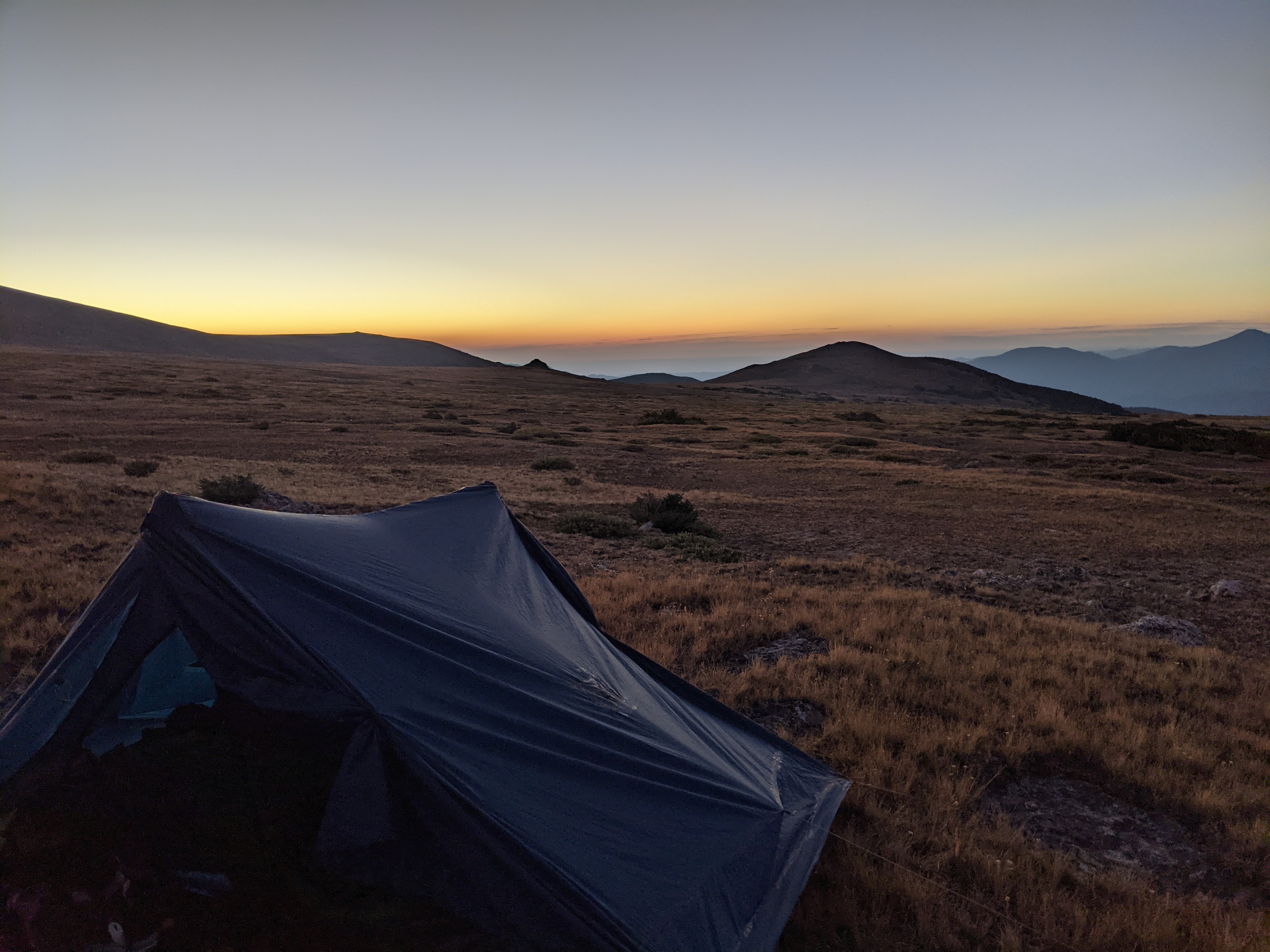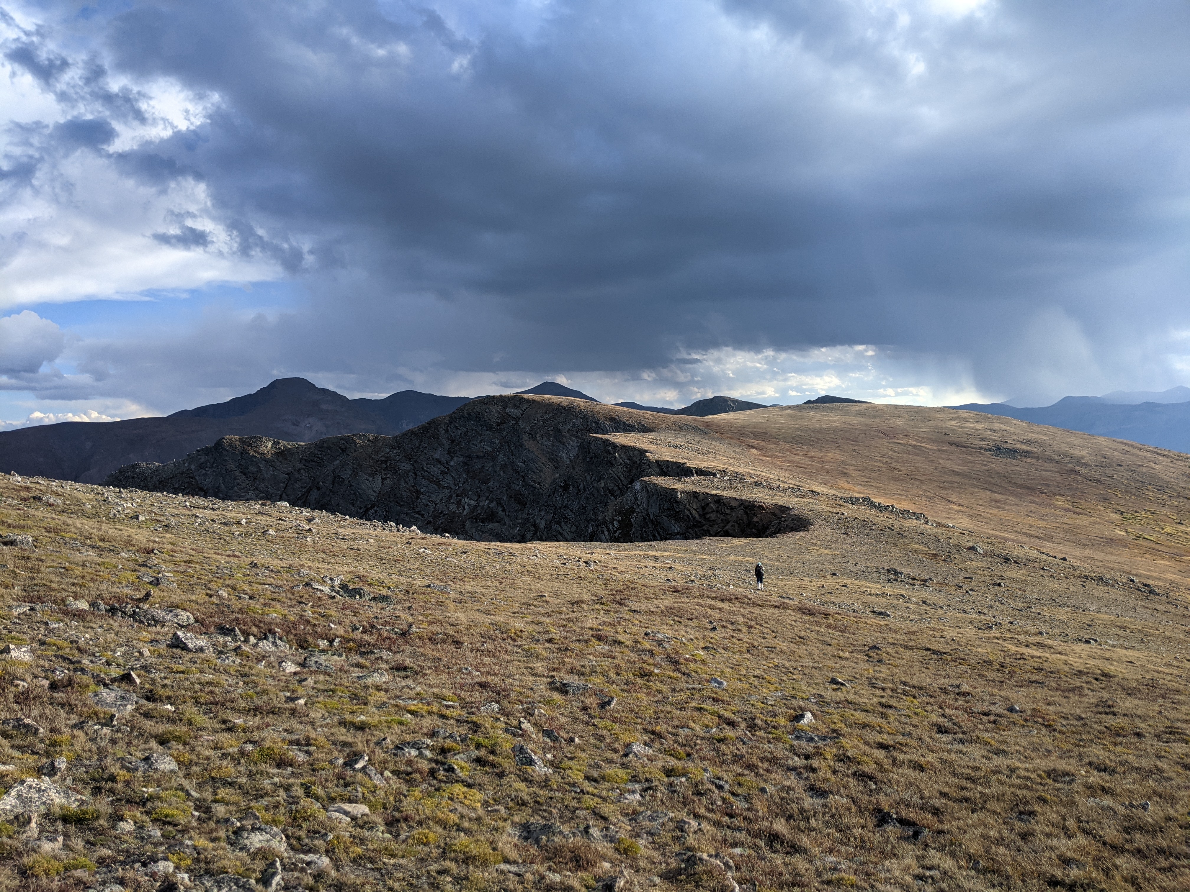 Eventually we found ourselves regaining all of the elevation we’d lost and then some, hiking a rather quick climb up to a ridge, where we were met with the edge of a storm we hiked alongside for the rest of the day. We threw on our rain gear and kept a nervous eye on the sky around us as we pushed ahead to James Peak. Luck was on our side, and while we did get a strong headwind and an occasional shower, the worst of the storm went around us and the skies cleared up for our final summit at sunset.