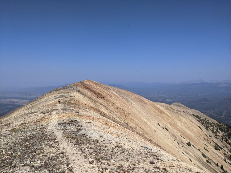And so the trail continued in that fashion for a few hundred miles: a lot of ridges and valleys with a few peaks and passes thrown in along the way. In the picture below, that ridge in the background is what we followed all the way up to the hut, starting from the base of the prominent peak in the center of the picture. The slight saddle above and slightly to the left of Matt is probably about where I was standing when I took the top left picture above, looking up towards the peak.